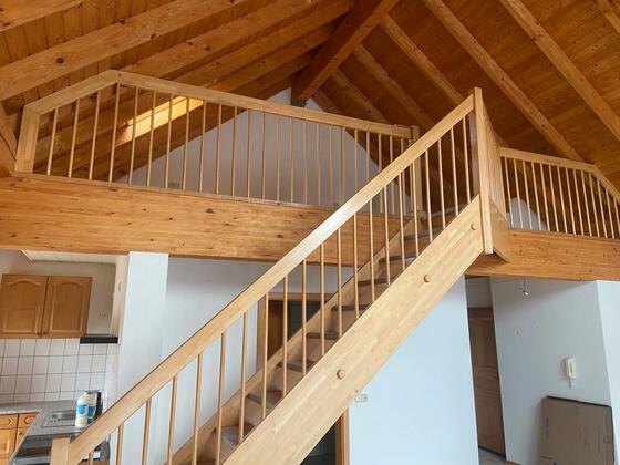 Wohnzimmer und Küche ist ein großer, offener Raum. Im Wohnzimmer geht eine Holztreppe nach oben ins offenes... mehr erfahren
